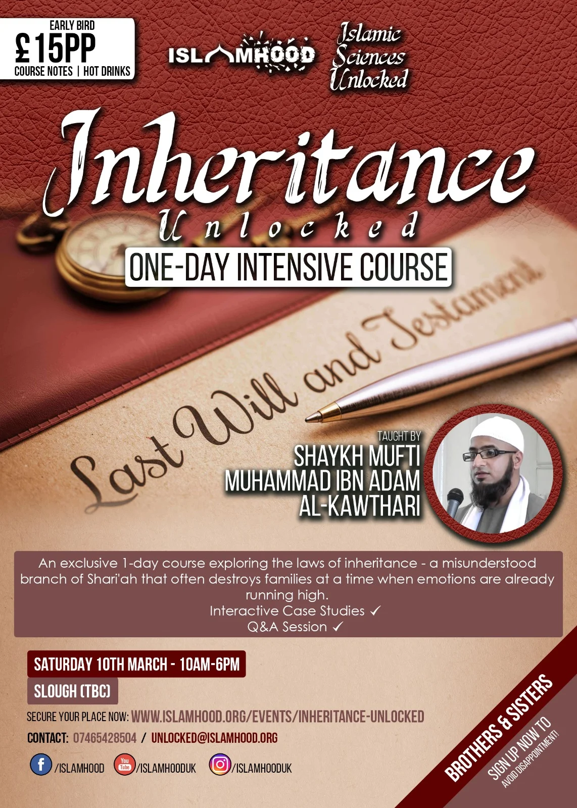 Join us on this exclusive 1-day course as we explore the laws of inheritance - a misunderstood branch of Shari'ah that often destroys families at a time when emotions are already running high